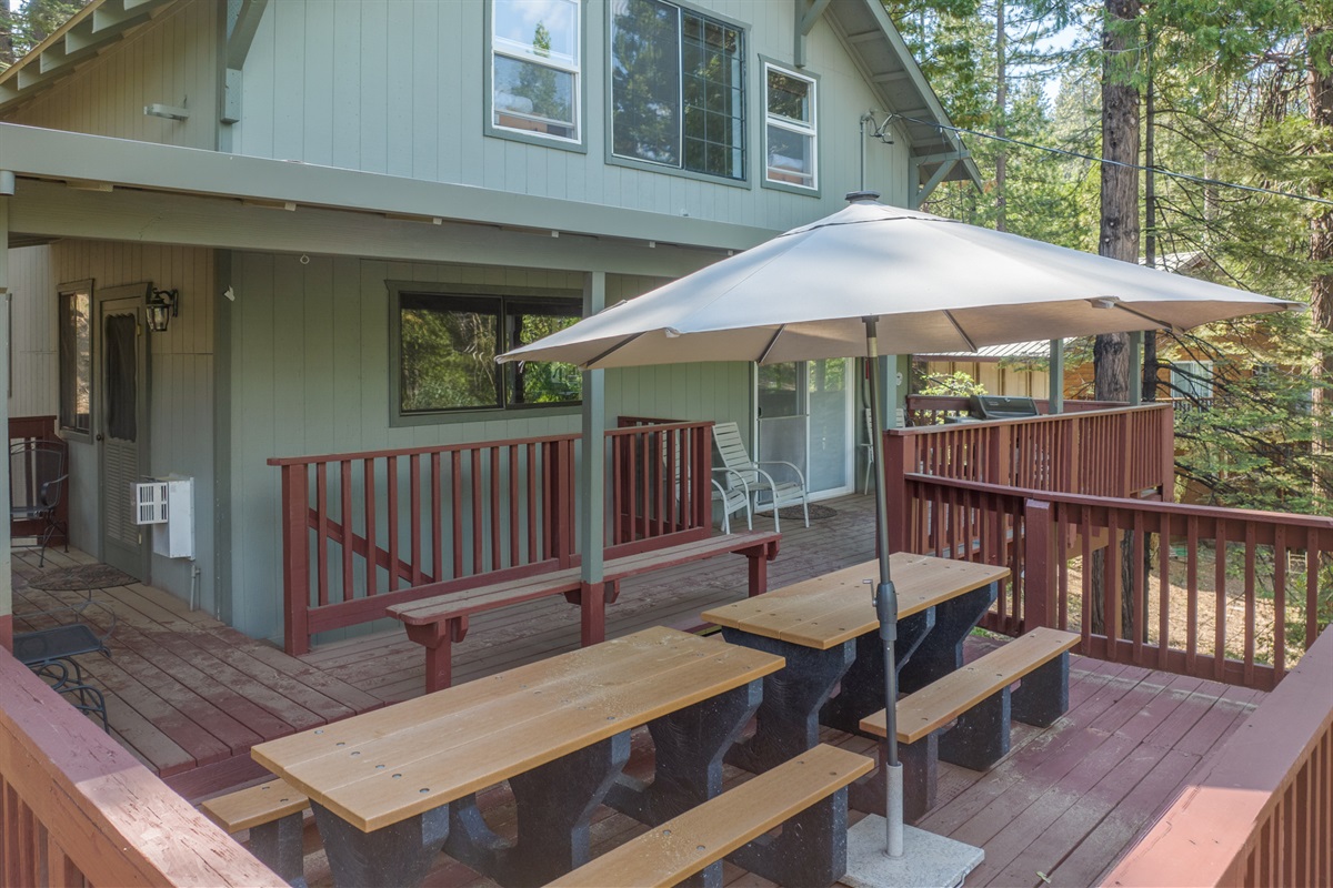 •Outdoor deck: Multi-level with two large picnic tables, 36” Blackstone and a propane BBQ.